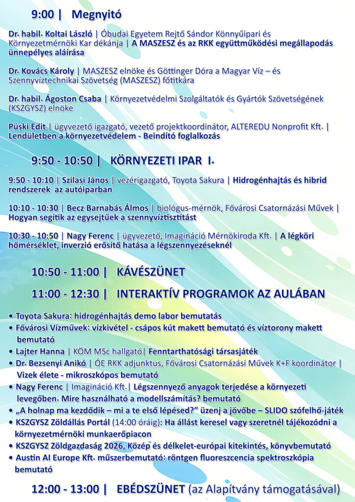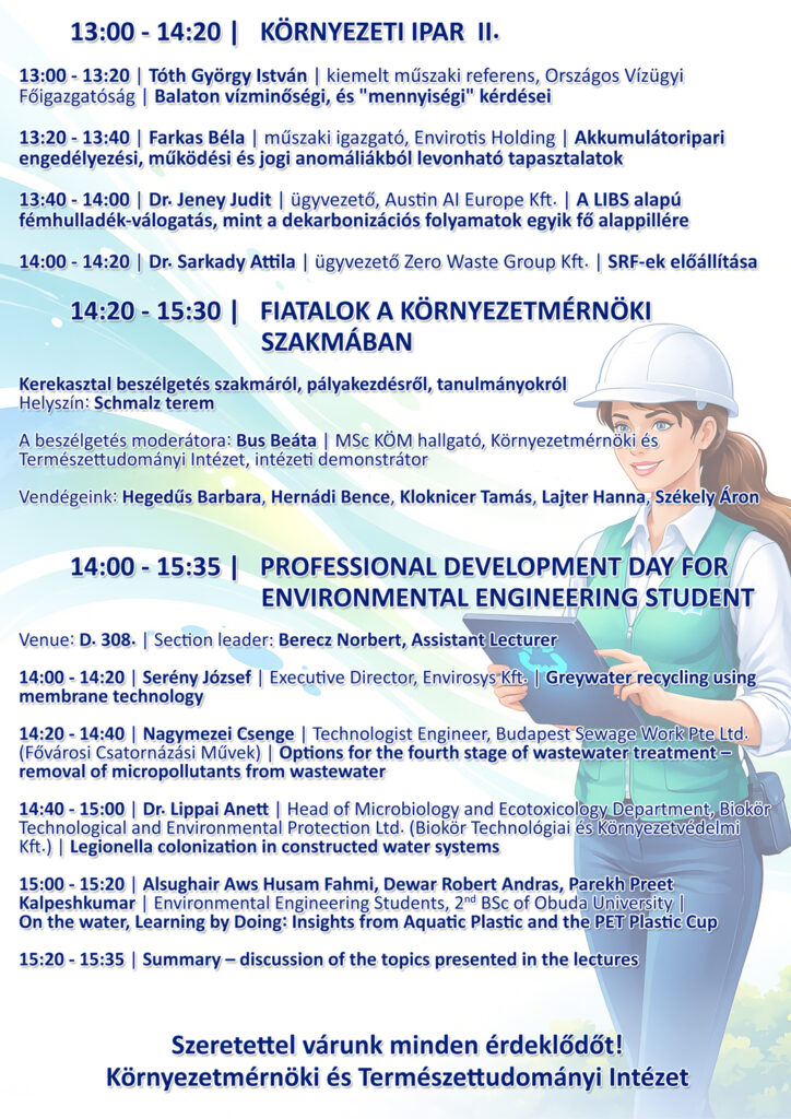 Az Óbudai Egyetem Rejtő Sándor Könnyűipari és Környezetmérnöki Karának Környezetmérnöki és Természettudományi Intézete 2026. április 15.-én szakmai napot szervez a fenntarthatóság aktuális kérdéseiről és a jövő mérnöki megoldásairól.
